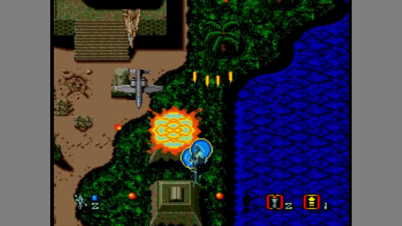 During the helicopter stages, you can fire, use a limited number of bombs or a limited number of shields. Occasionally, a stealth bomber will drop some power-ups for you, and some enemies also drop power-ups with random effects. During the phases on foot, you can fire a gun, jump and call in the helicopter. Jumps are used to avoid fire and to reach certain stationary defence systems with your gun. Calling the helicopter will have you controlling the helicopter similar to the close range attack, but the screen is fixed, you cannot proceed. Enemies can't harm the helicopter, so you can clear out the current screen. The helicopter cannot be called, however, once you are inside the building.