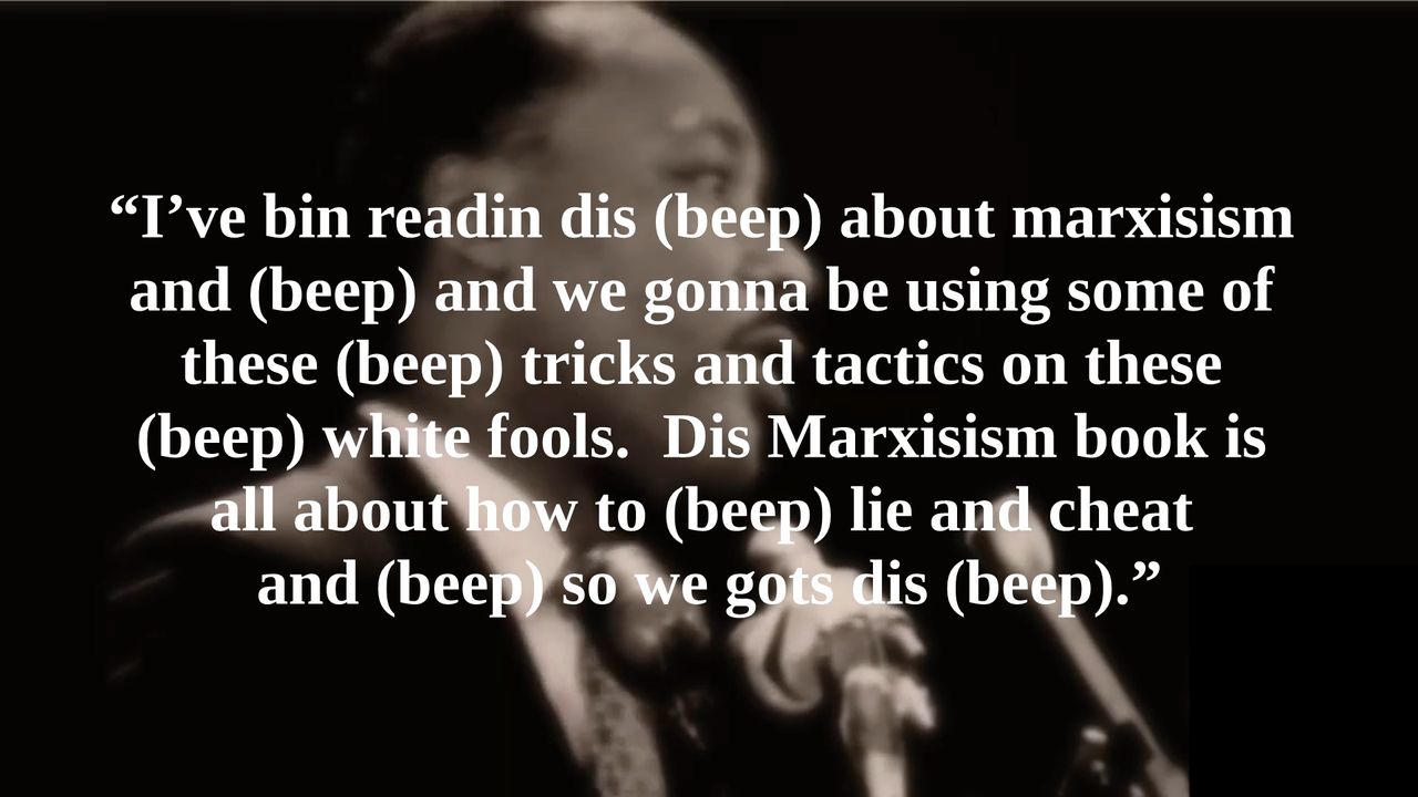 “I’ve bin readin dis (beep) about marxisism and (beep) and we gonna be using some of these (beep) tricks and tactics on these (beep) white fools. Dis Marxisism book is all about how to (beep) lie and cheat and (beep) so we gots dis (beep).”