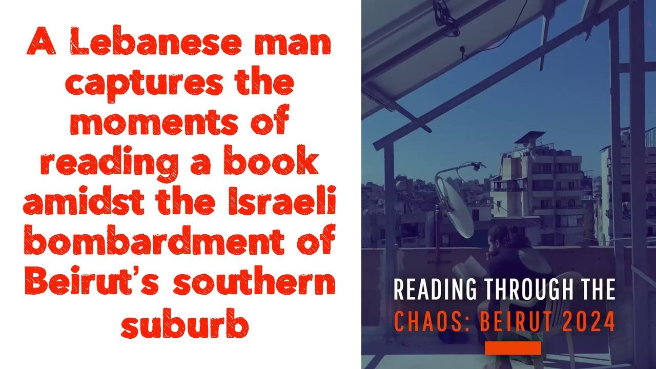 A Lebanese man captures the moments of reading a book amidst the Israeli bombardment of Beirut’s southern suburb, a testament to quiet resilience in the face of chaos.