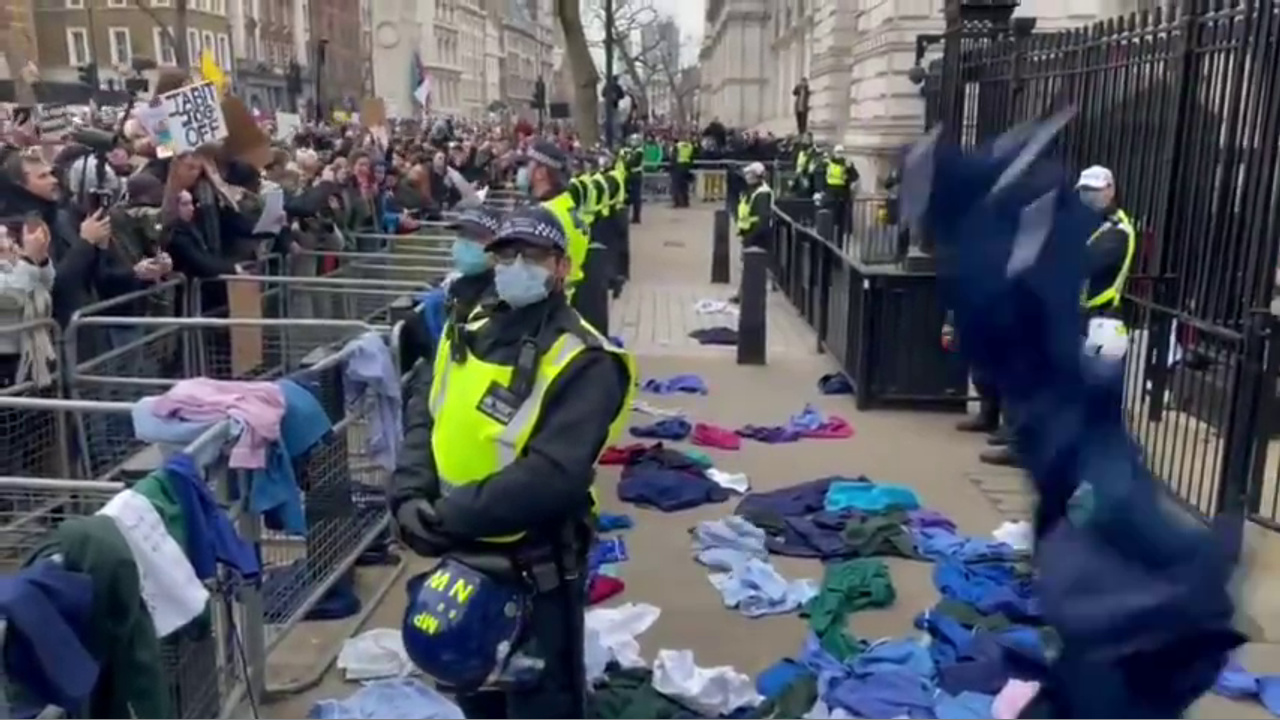 NHS Staff And Care Workers Throwing Their Uniforms At Downing Street