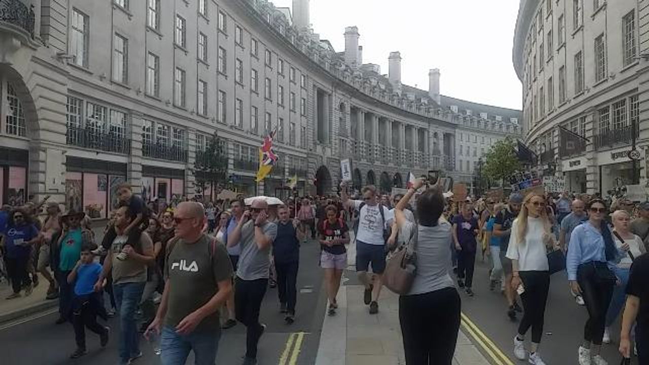 Protesters marching at Piccadilly Circus 18.09.21