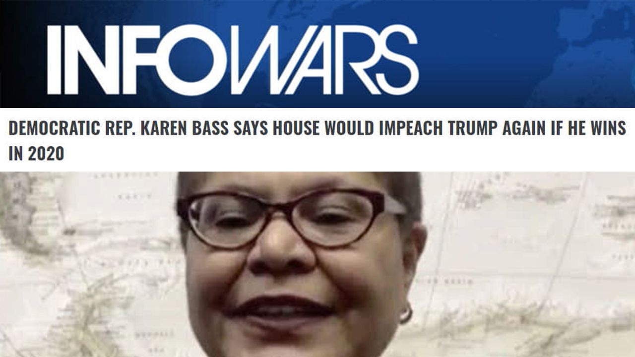 California Democratic Rep. Karen Bass said she would push to impeach President Donald Trump again if he wins the presidential election in 2020.
