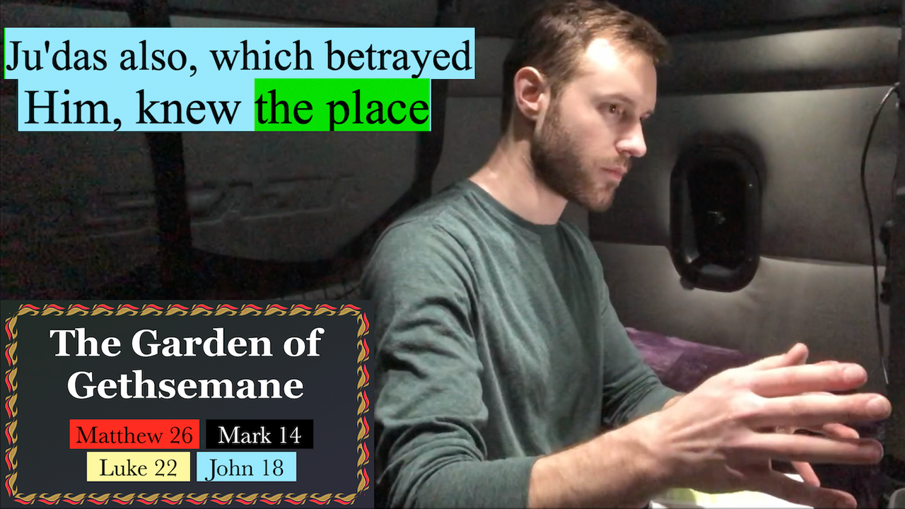 Matthew 26:36, Mark 14:32, Luke 22:40, John 18:1-2 combined