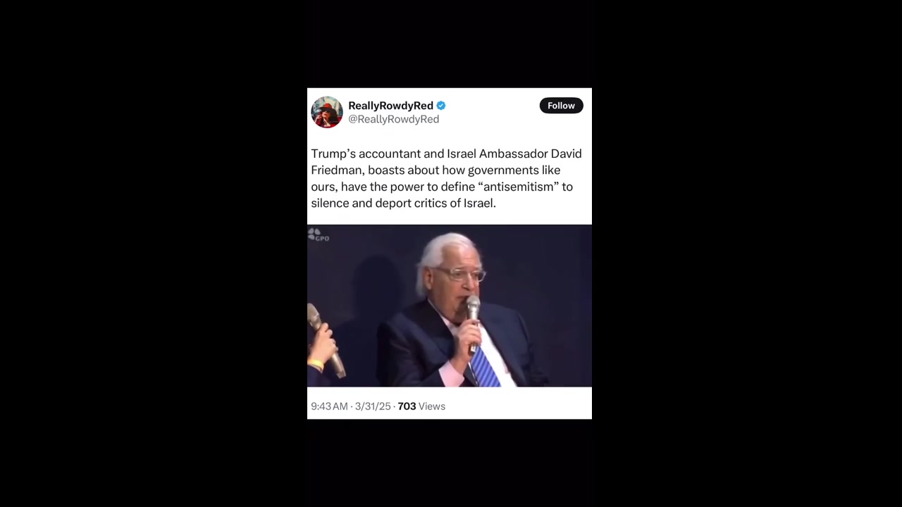 Trumps accountant & Israel Ambassador David Friedman, boasts about how governments like ours, have the power to define 'antisemitism' to silence & deport critics of Israel.