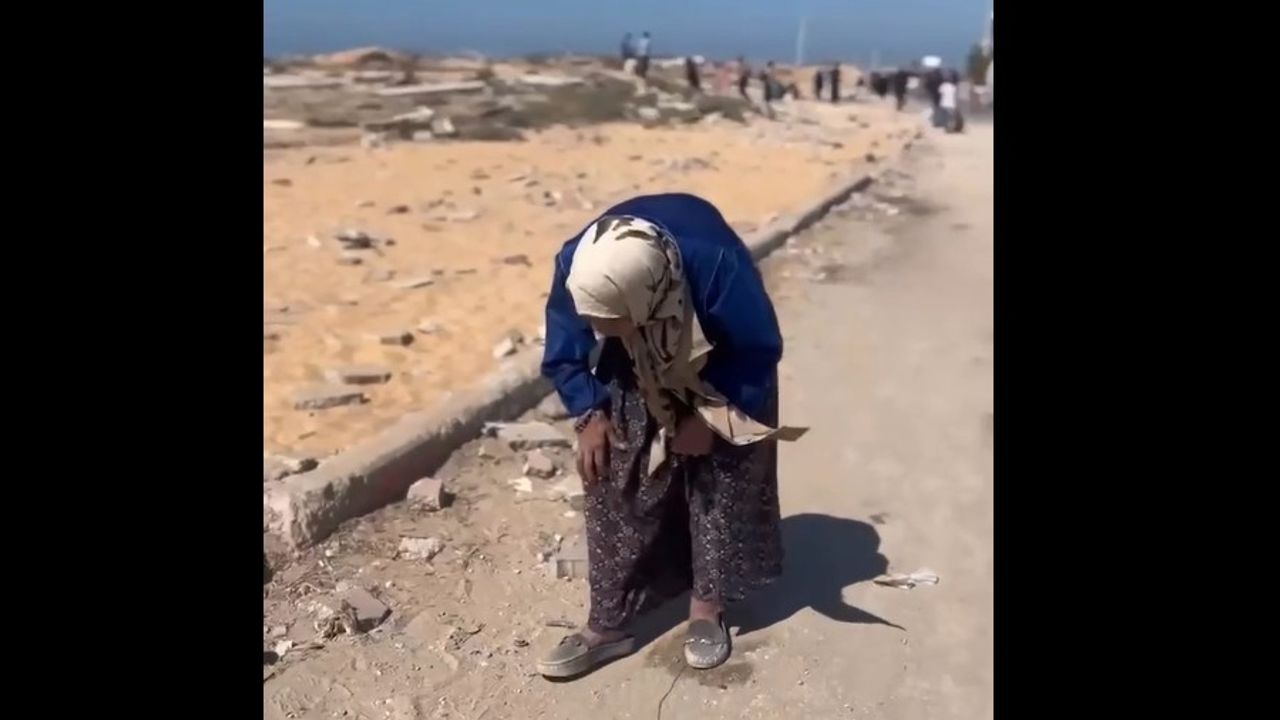 An elderly Palestinian woman struggles on a desperate trek on foot — forced to flee Gaza City amid the ongoing displacement.