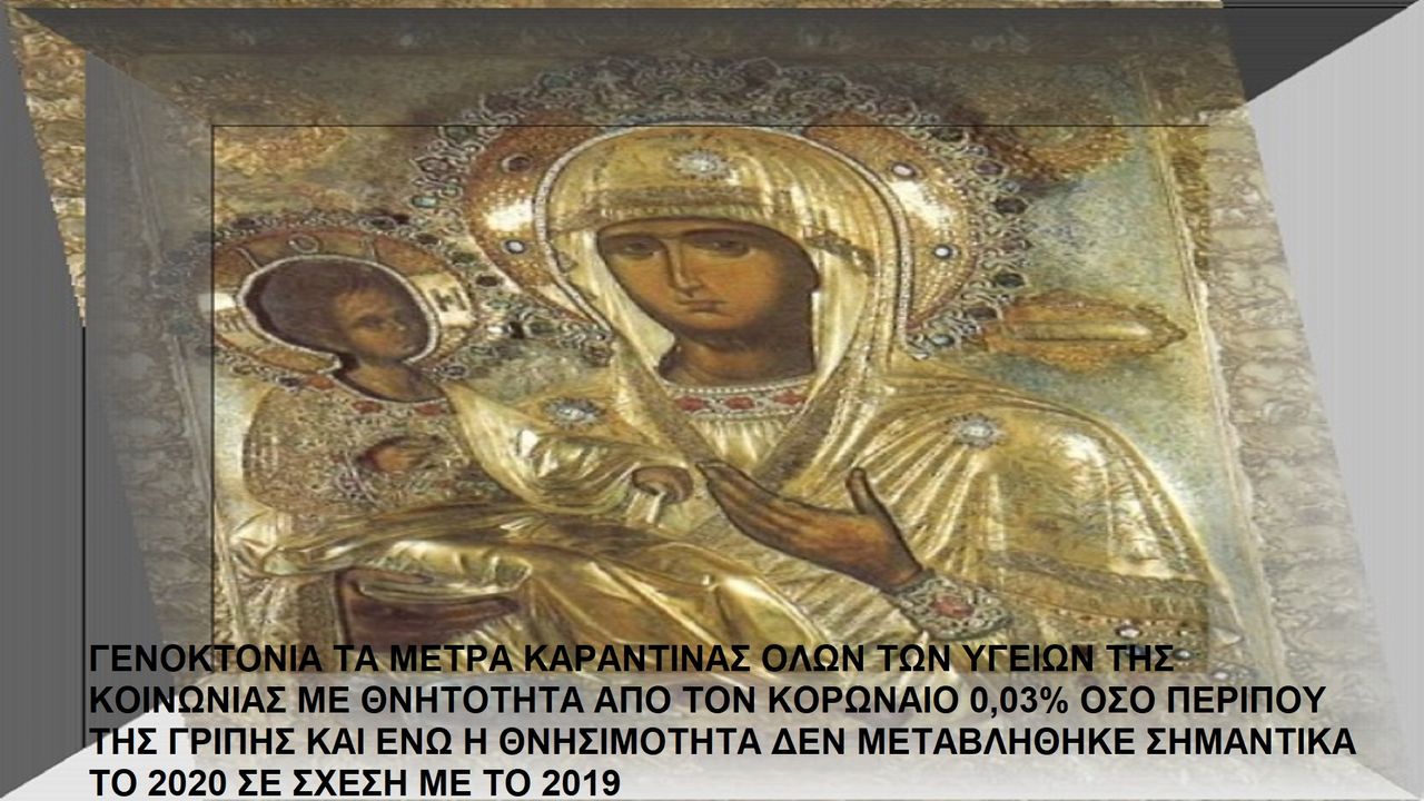 ΓΕΝΟΚΤΟΝΙΑ ΤΑ ΜΕΤΡΑ ΚΑΡΑΝΤΙΝΑΣ ΟΛΩΝ ΤΩΝ ΥΓΕΙΩΝ ΤΗΣ ΚΟΙΝΩΝΙΑΣ ΜΕ ΘΝΗΤΟΤΗΤΑ ΑΠΟ ΤΟΝ ΚΟΡΩΝΑΙΟ 0,03% ΟΣΟ ΠΕΡΙΠΟΥ ΤΗΣ ΓΡΙΠΗΣ ΚΑΙ ΕΝΩ Η ΘΝΗΣΙΜΟΤΗΤΑ ΔΕΝ ΜΕΤΑΒΛΗΘΗΚΕ ΣΗΜΑΝΤΙΚΑ ΤΟ 2020 ΣΕ ΣΧΕΣΗ ΜΕ ΤΟ 2019 http://www.freevolition.gr/greece.htm ...