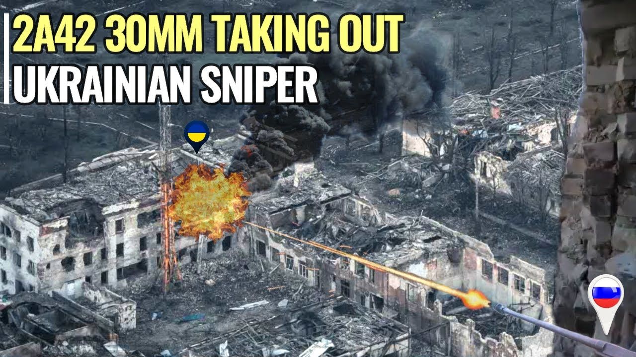 A moment from 2A42 30mm automatic cannon destroying Ukrainian sniper tower on the Maryinka front, Donetsk region. Finally, snipers are forced out of their comfort zone in a building by Russian troops' automatic cannon fire.