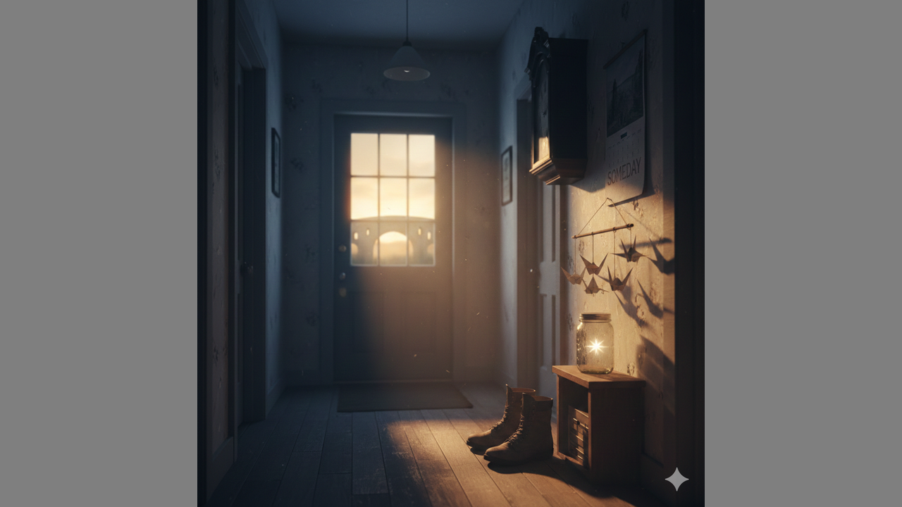 Now the hallway's quiet, the air is thin,