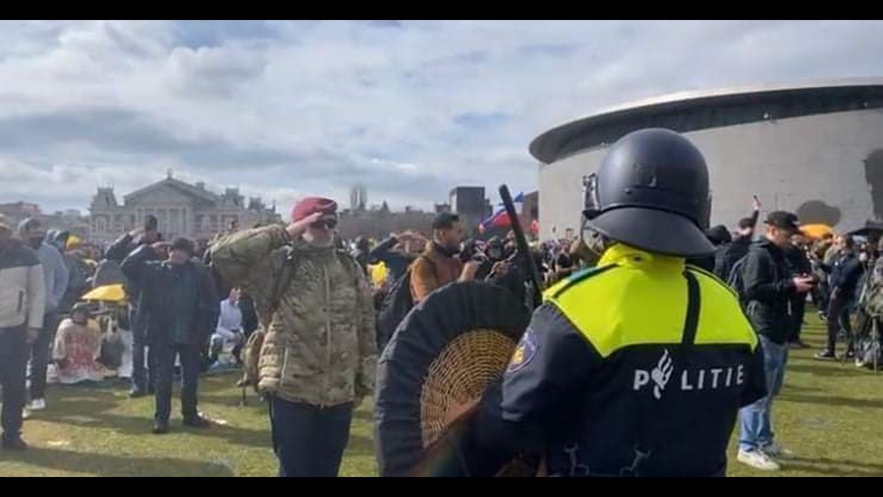 An old-fashioned freedom march (unfortunately necessary in 2021) through the old city of Amsterdam. 1st line of defense to protect the protesters was formed by veterans and a 2nd line of defense by nurses and healthcare workers. The riot police who were ordered to beat the protesters at the Museum square were put in their shirt when the crowd decided to march through the old city. They did not know what their orders further on were. And were too late every time they pursued the protesters.