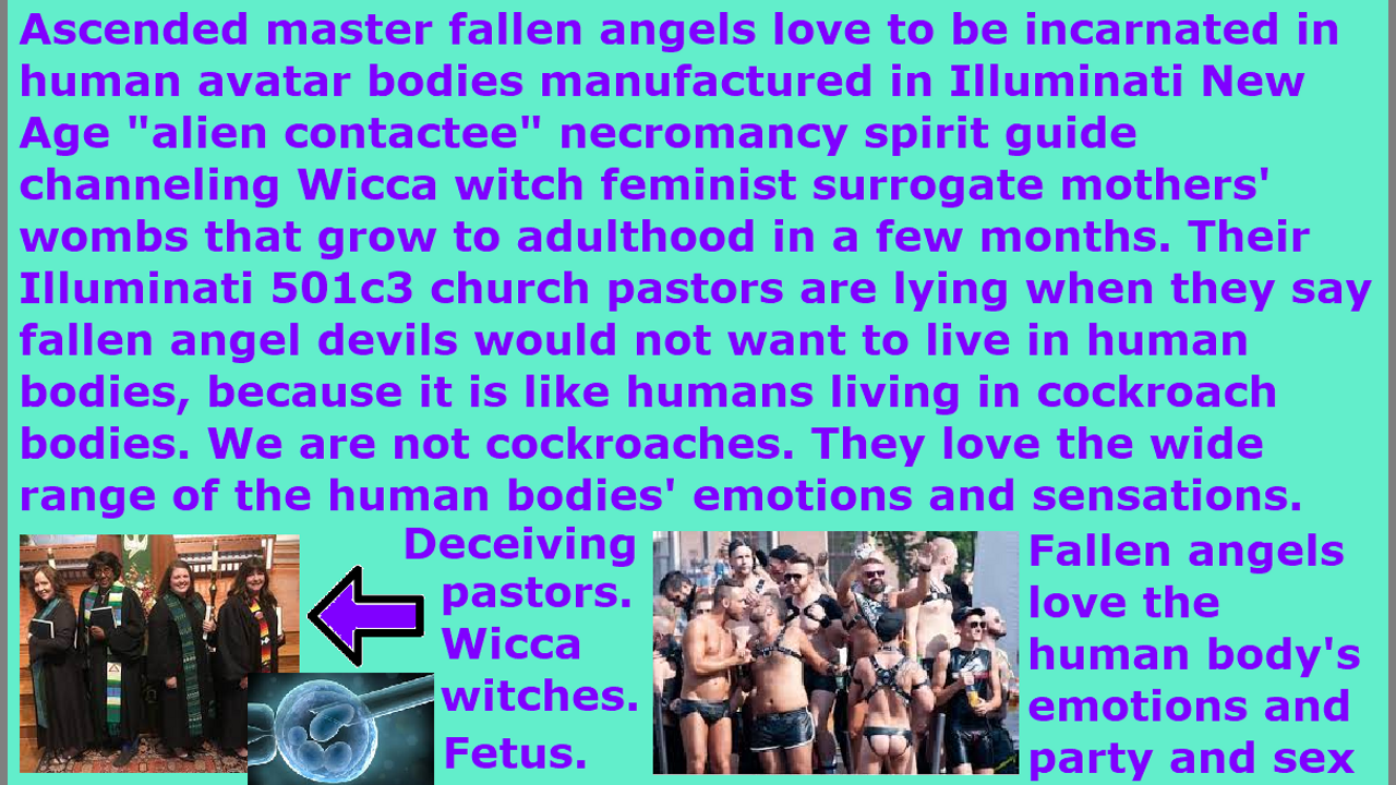 *** Intelligence news update from the Human Homo-Sapiens Race Survival Resistance (HRSR) headquarters and Republic Rebel Alliance battlefront (April 2021). Carolyn Hamlett exposes that the Illuminati ascended master fallen angels love being in the human body. (Video 29 minutes mark and 2 hour 18 minute mark.) It is because of its wide range of emotions and feelings, and the sensations of this physical realm. This is why both fallen angel devils and dead disembodied demon spirits of their nephilim & chimera alien children desire to be in human bodies. Many are incarnating into cloned hybrid human avatar bodies that grow to adulthood in a few months or into stolen “walk in” human bodies of their various Illuminati NWO New Age Wicca witch “alien contactee” necromancy spirit guide channeling séance various Atlantis nephilim civilization occult mystery school religions’ demon-possessed MILAB-abducted human servants. They either wear those soul-scalped human meat suits or shapeshift. When none of the church pastors or millions of religious Christian convert hordes speak about this and stays completely away from what Carolyn Hamlett exposes, it shows to me that Carolyn’s information is all true, and the demons of fear of assassination and pride of reputation inside the bodies of the pastors and religious Christian hordes are prohibiting them from sharing these vital critical important truths that the fallen angels are also walking amongst us now in human avatar bodies. The demons will speak all kinds of excuses into their ears, in order to prevent them from speaking or passing on any of these deep secrets of Satan Lucifer to their fellow humans, as the Bible’s “watchmen on the wall.” If you look at what the Illuminati hired shill pastors, who they do not try to kill every day but allow them to become church pastors, and the religious Christians stay away from exposing, then you know those are the things which are most likely to be the truth. This is also why these pastors and millions of religious Christian convert hordes do not expose that the Global Ethic Institute leaders and Council of World Religions’ ascended masters are fallen angel incarnate avatars. From a real Christians’ perspective, it was hard to understand why the pastors and millions of religious Christians are completely silent about this, and all other information Carolyn Hamlett risked her life exposing, but now I understand that whatever the pastors and religious Christians do not share with their fellow humans are most likely because it is the truth. If it were disinformation and lies like the “Post Pan Pre-Wrath Tribulation Rapture Theories lies AntiChrist fake millennial kingdom of Christ,” then they would be fanatically arguing for and teaching these things. If you look at what they teach and what they hide, then you will know what is the lie and what is the truth. If they spoke the truth and exposed the lies, then the devil and the NWO would be trying to kill them every day, and all their church donators and book customers would leave them in anger and disgust like the crowds left Jesus and us real Christians, just as in every case throughout the Bible and throughout human history. Whatever the apostate End Times lukewarm Laodicea Church does not like to warn or expose or teach, and are completely censoring in silence, those are the things you need to warn and expose and teach, because it means it hurts the devil and the NWO. The Illuminati 501c3 nephilim & chimera alien incarnate avatar demon spirit church pastors or demon-possessed & demonized church pastors spread the disinformation for Satan Lucifer that “for the fallen angel devils to live inside the human avatar bodies made in the image of the Almighty God is like a human living inside a cockroach body or a garbage can,” so they do not believe that fallen angels would ever dwell inside a human body. End of transmission…