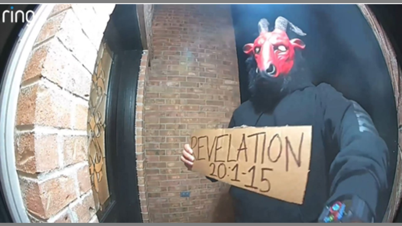 THE Next NWO Agenda, Make Christians Look Evil. "An unidentified man wearing a demonic mask and holding a sign bearing an ominous Bible verse (Rev 20) has been seen knocking on a door via a Ring camera. " Smells like a psyop especially if we see more activity around this theme. In Hollywood, Christians have been portrayed as evil, dumb, racists, and not accepting of alternative lifestyles. Christians will be the ones that won't poke themselves with the next plandemic or hook up to the Ai beast system. My next VCAST 396 will cover psyops around this theme.
