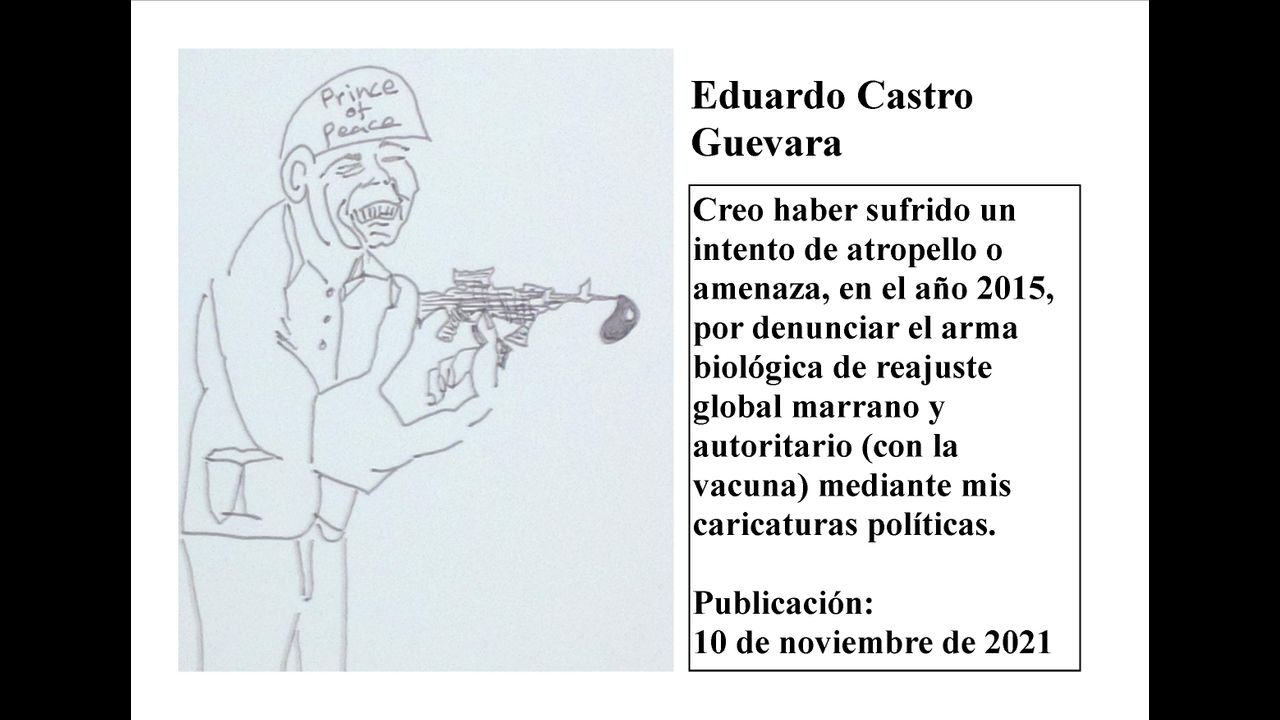 Creo haber sufrido un intento de atropello o amenaza, en el año 2015, por denunciar el arma biológica de reajuste global marrano y autoritario (con la vacuna) mediante mis caricaturas políticas.