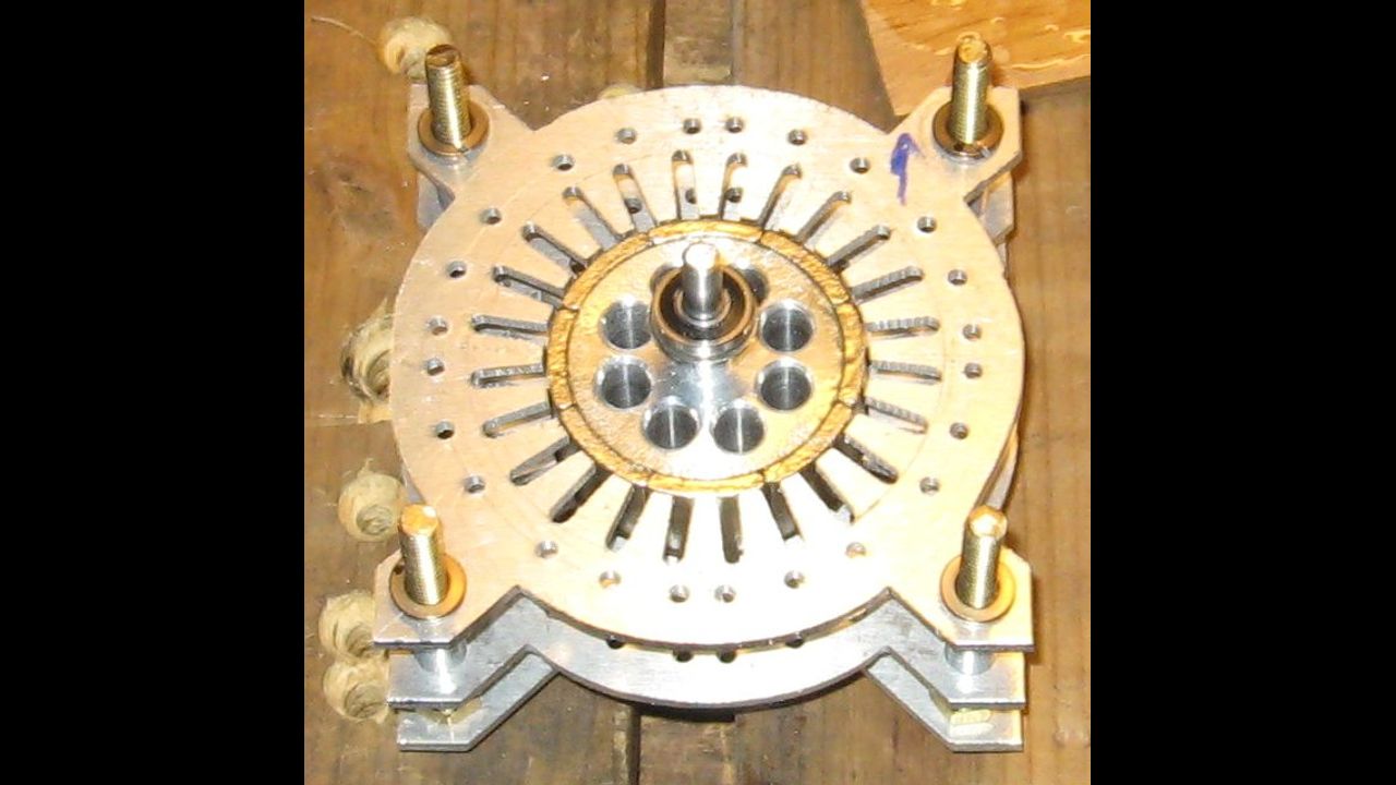 This is the DiaMag8 Alternator. I expanded my rotor size to two inches, and used Arc Segment Magnets on an Aluminum Core for the rotor. Also I changed the winding to be wound on the outside of the Stator, rather than the inside, like DiaMag7. This allows the Rotor to be removed after the Alternator is wound, something that was very useful, because I did have to take it apart. This test developed around 14 Watts.