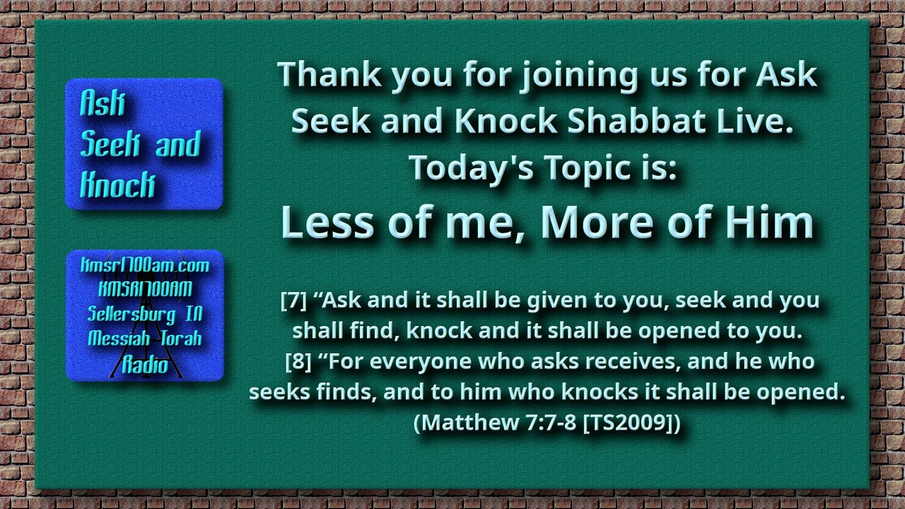 Thank you for Joining us with kmsr1700am.com for another addition of Ask Seek and Knock Shabbat Live Study. Today we discuss “Less of me, More of Him! Part 1”. Grab your highlighters and your Scriptures and lets get to it.