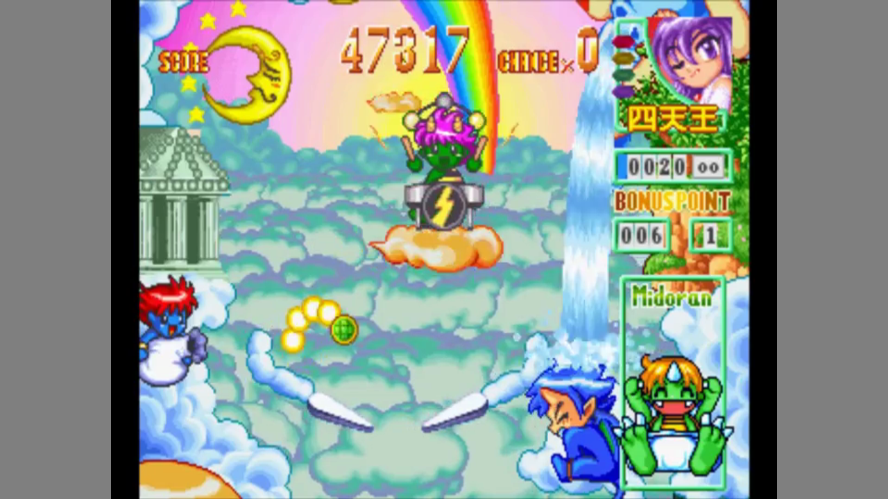 The game is similar to Dino Land, Dragon's Revenge or Techno Soft's own Dragon's Fury, with a single table featuring enemies to smash with the pinball and boss fights on a separate screen. The game has a fantasy theme which blends European fantasy with Japanese mythology and a cartoon style very similar to the Puyo Puyo series. Before you launch a new ball, you can choose between one of three characters to support you, and each will give you a different bonus. You can save your game any time, though it will only save the state of the table to up before you launched the current ball. Instead of saving, you can also have a password for your progress.
