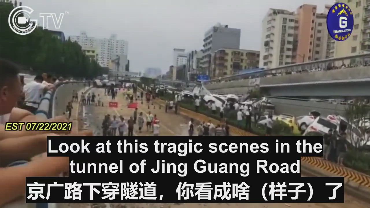 07/22/2021 After the flood in Zhengzhou, a tragic scene in the Jingguang Road tunnel as car wrecks piled up. Drivers or even a whole family were trapped in the car wrecks.
