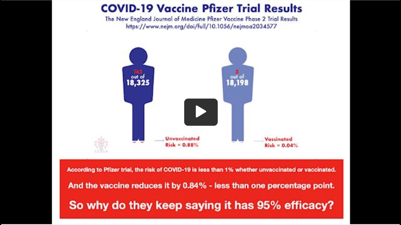 Pfizer reported that its vaccine shows a 95% efficacy. That sounds like it protects you 95% of the time. But that's not what that number actually means. That is the relative risk reduction which does NOT tell you what your overall risk is reduced by vaccination. For that number, we need to look at absolute risk reduction. This video explains the difference and why it's important to understand.