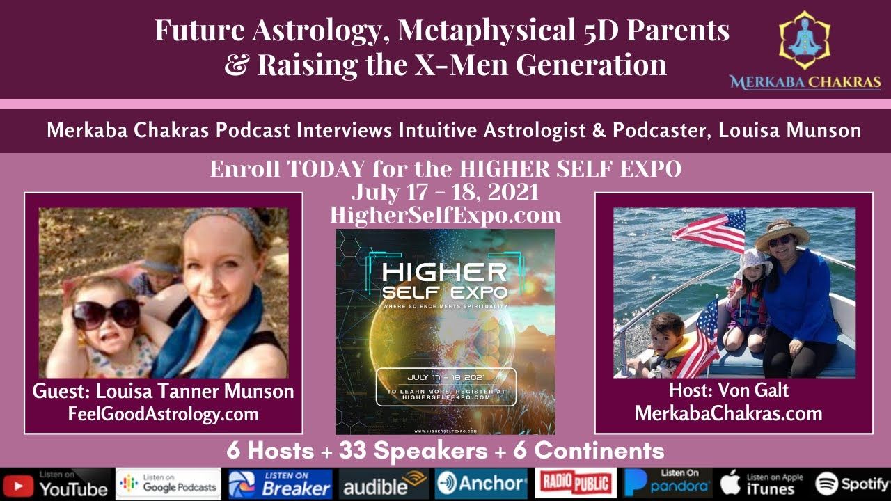 Welcome to another podcast episode of Merkaba Chakras. I’m your host, Von Galt. Today, we talk to Intuitive Astrologist, Louisa Tanner Munson, who reads her client’s possible future timelines. If you don’t like what is your probable future options are, you can change it. Plus, we talk about the role of metaphysical moms and 5D parents who help their children harness their 6th senses in this new processional cycle on Earth. Earth is cooking with the beginnings of the X-Men of the 5th dimension. So metaphysical parents, this episode is for you! Louisa, welcome to Merkaba Chakras!