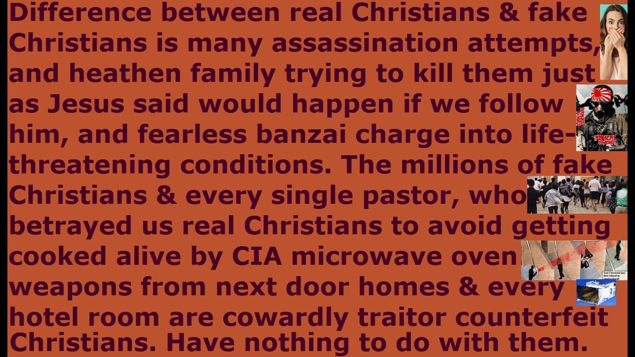 *** Intelligence news update from the Human Homo-Sapiens Race Survival Resistance (HRSR) headquarters and Republic Rebel Alliance battlefront (July 2025). The difference between real Christians & fake Christians is the fact that real Christians receive many assassination attempts, and their heathen families try to kill them just as Jesus said would happen if we follow him, and their fearless banzai charge into life-threatening conditions. All the Western feminist nations’ “Jezebel demon-possessed” “strong independent women” feminist women run away and betray us real Christians in terror & horror & selfishness & cowardice & treachery & silence & hiding & condoning the tens of thousands of truths we real Christians shared to them. The beautiful feminine gentle subservient humble serving quiet compassionate “Holy Spirit filled” real Christian women banzai charge the tens of thousands of CIA NSA MI6 FBI Freemason Jesuit Wicca Black Ops Satanist assassins & world elites & their governments & their militaries & their Satanist secret societies & their reptilian Satanist elites’ Isis witchcraft Muslim terrorist organizations & their reptilian Satanist elites’ Santeria witchcraft South American drug cartels & their reptilian Satanist elites’ African Voodoo witchcraft genocide psychopath warlord gangs, and drive unguarded into dangerous Muslim terrorist and heavily-armed genocide psychopath Satanist Luciferian witchcraft African warlord gang territory to seek out God’s lost sheep, and preach to the people sent to kill them who have guns pointed at their heads, and keep speaking the tens of thousands of truths when they have assassins trying to shoot them in their apartment lobbies, and they get poisoned by NSA sulfuric acid & polonium radiation & mercury & flesh-eating biochemical weapons, and they receive demon spirit attacks all day long every day who rip in half their own Satanist Catholic exorcist priests, and they reach the brink of starvation many times, and they get shot by FBI pinpoint heart attack EMF weapons from next door homes & every hotel room, and get gassed by Mossad sarin gas through their room vents, and their sink & shower water get infected with hundreds of bioterrorism biological weapons, and their heathen families are either slaughtered or their brains taken over by the demons to try to kill them just as Jesus promised would happen if you become a real Christian because we live on opposite sides of the spiritual war. The millions of fake Christians & every single pastor, who betrayed us real Christians to avoid getting cooked alive by CIA microwave oven weapons from next door homes & every hotel room are cowardly traitor counterfeit Christians. Have nothing to do with them just as “2 Timothy 3:2-5” commands, dear brethren. They are a blasphemy against our Almighty Holy Loving Righteous Creator Father God YHWH Jesus and his Word and his reputation and his testimony and his righteousness and his self-sacrificial love of Jesus and everything that our true God stands for by calling themselves “Christians” and “God’s representatives” and “God’s army” and “God’s people,” when they worship their cowardly traitors’ post-1960s “love & light” fake god “Sananda Jesus” and their “Bible verses redefining, women’s head coverings rebelling, fallen angel head controlled, men’s pants cross-dressers androgynous transgender God’s-Word-mockers” fake goddess Jezebel, whose Draco reptilian chimera fake alien incarnate avatar pedophile cannibal Satanist “earth’s hidden matriarchal rulers” witch feminist global child-trafficking ring minions torture & lesbian rape (peg) & satanically sacrifice & eat 12 million children every year, and throws their human meat & bone ashes into the millions of church member witch assassins’ church food, which these fake Christians cover-up & hide & conceal