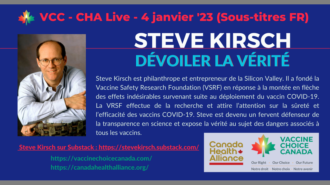 Steve Kirsch est philanthrope et entrepreneur de la Silicon Valley. Il a fondé la Vaccine Safety Research Foundation (VSRF) en réponse à la montée en flèche des effets indésirables survenant suite au déploiement du vaccin COVID-19. La VRSF effectue de la recherche et attire l’attention sur la sûreté et l’efficacité des vaccins COVID-19. Steve est devenu un fervent défenseur de la transparence en science et expose la vérité au sujet des dangers associés à tous les vaccins.