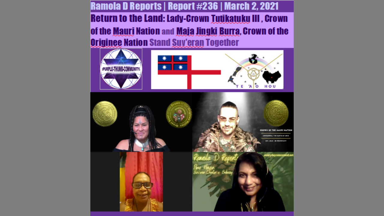 Report 236 | Part One, Return to the Land: Lady-Crown Tutikatuku III, Crown of the Mauri Nation and Maja Jingki Burra, Crown of the Originee Nation Stand Suv'eran Together