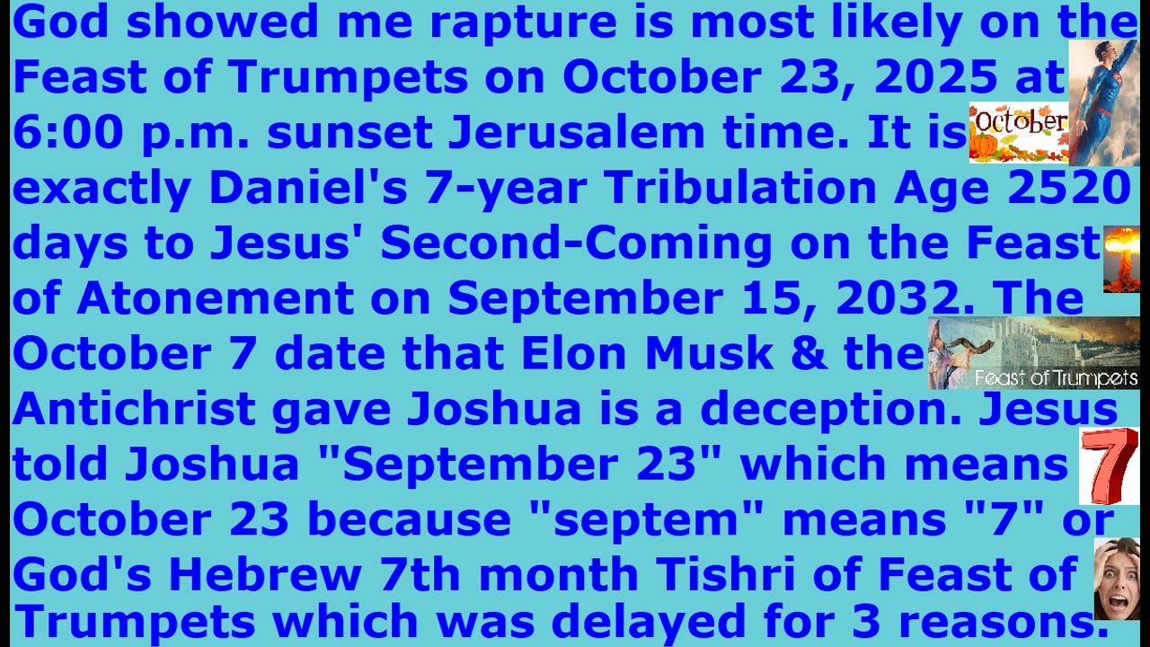 *** Intelligence news update from the Human Homo-Sapiens Race Survival Resistance (HRSR) and Republic Rebel Alliance battlefront (October 2025). God showed me today, because we real Christians are his friends & his brothers, that from the Feast of Trumpets Yom Teruah this year on October 23, 2025 in which the rapture may take place to the Feast of Atonement Yom Kippur on September 15, 2032 at Jesus’ Second-Coming at Armageddon which is the date Jesus gave Joshua, there are exactly 2520 days (7 years Tribulation Age judgment), which is the number of days that God gave us in his Bible through Daniel’s prophecy of two 3 and a half year periods of 1260 days or 42 months (42 months x 30 days in the Hebrew month) or what the Bible calls “a time, times, and half a time”. This is why Jesus told Joshua, “I will return to rapture my Bride my Church in a matter of days”. Therefore, October 22, 2025 sunset 6:00 p.m. Jerusalem time is a high-watch rapture day and hour on the Feast of Trumpets Yom Teruah, which is called the feast in which “no one knows the day or the hour”. Jesus told Joshua that he will return to rapture his Church Saints and Bride on September 23, 2025. “Septem” means the “seventh month” in Latin, and September used to be the seven month in the ancient Roman calendar, which was used during the time Jesus was here on the earth. God’s Hebrew month of “Tishri”, in which the Feast of Trumpets Yom Teruah always starts according to God’s command in the Bible, is the seventh month in the Hebrew calendar, which often lands in September of our current modern Gregorian calendar, which also used to be the seventh month until Satan Lucifer’s Draco reptilian chimera fake alien incarnate avatar pedophile cannibal Satanist globalist elite feminist witch “earth’s hidden matriarchal rulers” changed it to try to confuse God’s Christians. In other words, when Jesus was telling Joshua that he was going to return on September 23, 2025 to rapture his “Bride of Christ” Church Saints, he was most likely telling Joshua that he was coming back to rapture his real Christians on the 23rd day of the seventh month. That is not the current modern day Satanists’ Gregorian “September” ninth month, which used to be the seventh month in Jesus’ days 2000 years ago, but rather, Jesus was referring to the “September” (“septem” means “seven”) seventh month of his own God’s Hebrew calendar which is the month called “Tishri”. The feast of trumpets always begins the Tishri month seventh month or “september”. In Exodus 12:2, God commanded that Nisan (the month of the Feast of Passover) in spring of new beginnings be the beginning of the New Year, so Tishri is the seventh month according to God. The seventh month of Tishri always begins at the new moon sighting of the Feast of Trumpets Yom Teruah when the sliver of the new moon is observed. In God’s Hebrew calendar, the next day begins at sundown of the previous day. Therefore, if sundown on October 22, 2025 is at 5:59 p.m., that means 6:00 p.m. begins the 23rd day of October. If Jesus said he will return on the 23rd, it would make sense, because the 2025 Feast of Trumpets Yom Teruah begins on the 23rd day of October this year, which would be the seventh month of God’s Hebrew calendar or “September” in the Roman Latin language. What Jesus told Joshua makes complete sense. The Feast of Trumpets could not be on September 23-24, because of three reasons, as I mentioned in my previous daily sermon & video: 1) The barley harvest this year was not ripe “aviv” by the Passover feast’s “omer” bread, 2) It was not yet the Spring equinox for the Feast of Passover, 3) It was not yet the autumn equinox for the Feast of Trumpets.