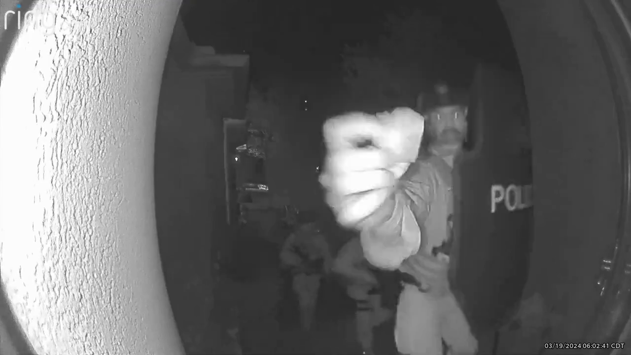 Outside, a convoy of 10 law enforcement vehicles rolled into his upscale neighborhood in West Little Rock, Arkansas, parking near his 3,000 square foot home, a neighbor’s doorbell camera shows.