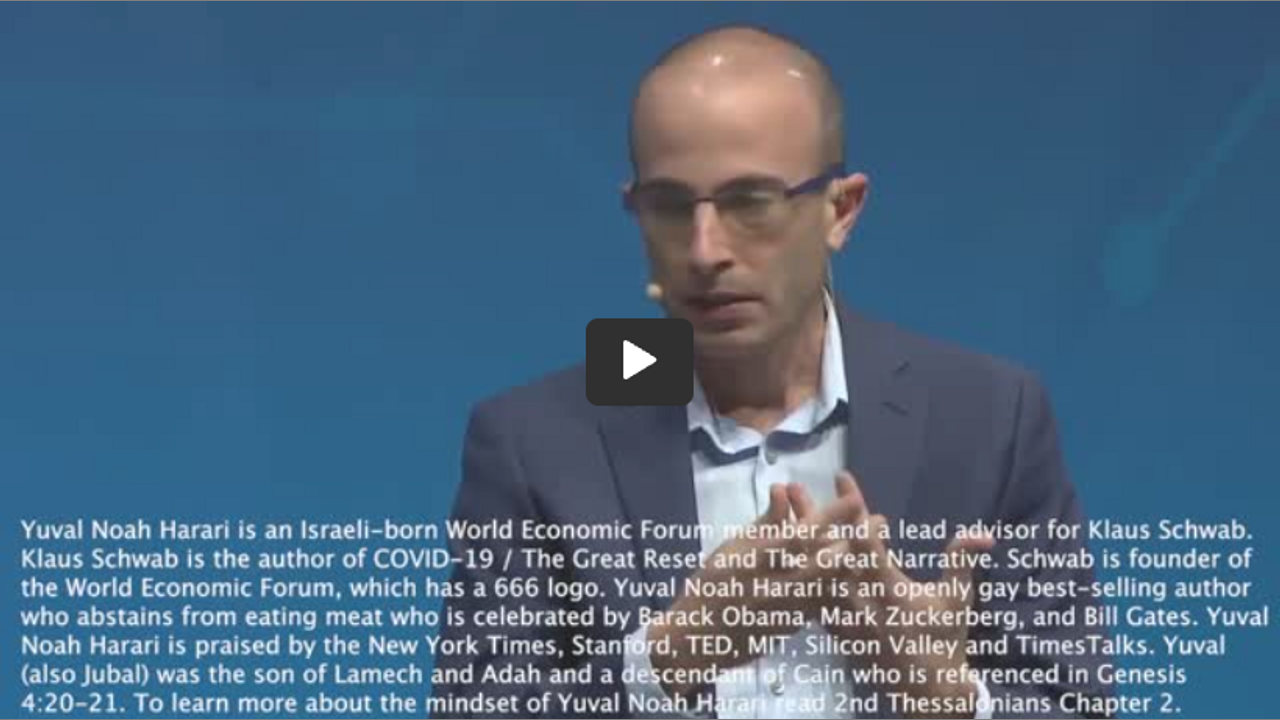 Yuval Noah Harari is an Israeli-born World Economic Forum member and a lead advisor for Klaus Schwab. Klaus Schwab is the author of COVID-19 / The Great Reset and The Great Narrative. Schwab is founder of the World Economic Forum, which has a 666 logo. Yuval Noah Harari is an openly gay best-selling author who abstains from eating meat who is celebrated by Barack Obama, Mark Zuckerberg, and Bill Gates. Yuval Noah Harari is praised by the New York Times, Stanford, TED, MIT, Silicon Valley and TimesTalks. Yuval is a Hebrew first name which means “father of music,” stream, brook, or tributary. In the Hebrew Bible, Yuval (also Jubal) was the son of Lamech and Adah and a descendant of Cain who is referenced in Genesis 4:20-21. To learn more about the mindset of Yuval Noah Harari read 2nd Thessalonians Chapter 2.