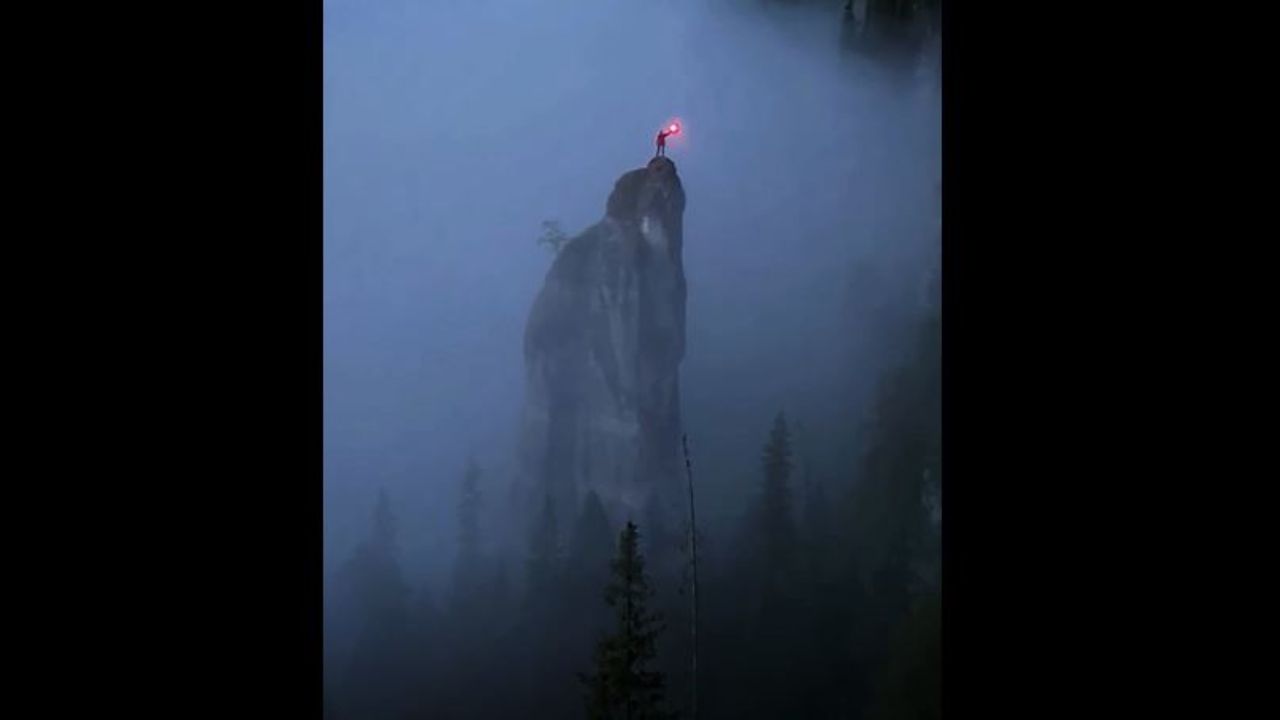 Shining the Beacon of Light on a Misty Mountain Top - Russia. The Urals. The Perm Region. River Usva. Huge Rock, column mountain, called 'The Devil's Finger'.