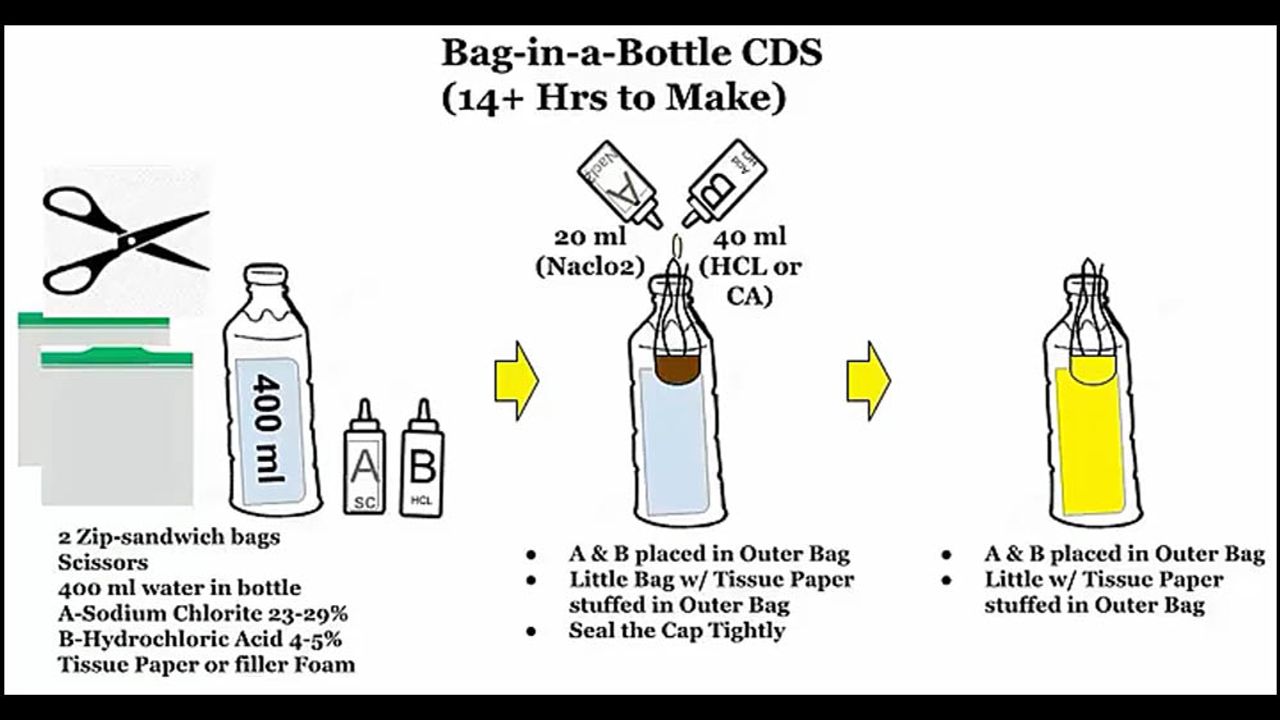 Brian Stone demonstrates Scott McRae's method of making CDS using simple, easily found plastic sandwich bags and water bottles. Activation time is about 14 hours, or when the colors of CDS and the reactor solution are the same.