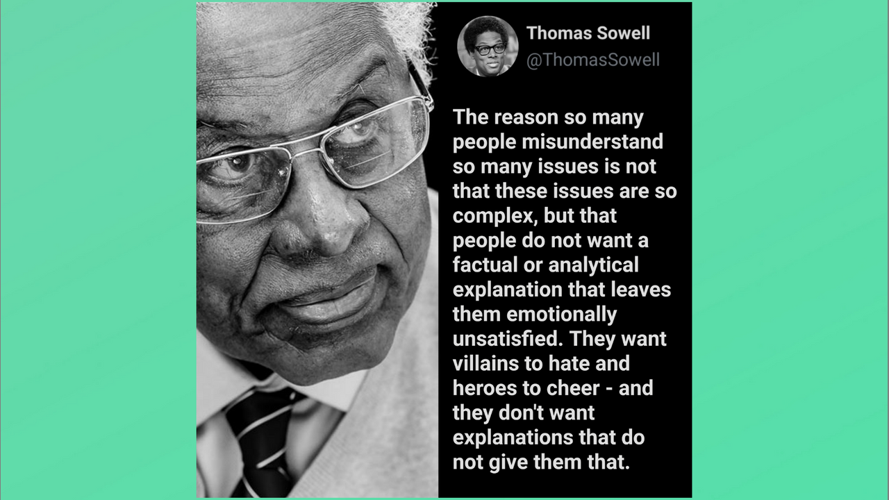 "The reason so many people misunderstand so many issues is not that these issues are so complex, but that people do not want a factual or analytical explanation that leaves them emotionally unsatisfied. They want villains to hate and heroes to cheer - and they don't want explanations that do not give them that."