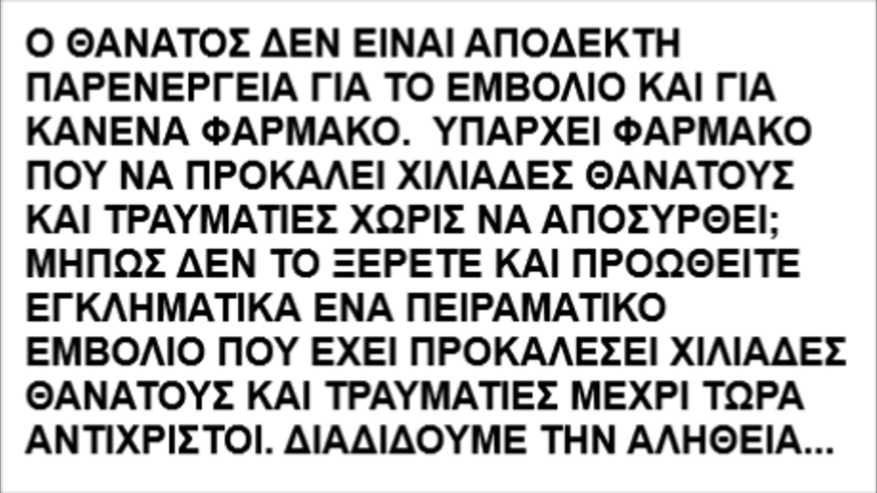 Ο ΘΑΝΑΤΟΣ ΔΕΝ ΕΙΝΑΙ ΑΠΟΔΕΚΤΗ ΠΑΡΕΝΕΡΓΕΙΑ ΓΙΑ ΤΟ ΕΜΒΟΛΙΟ ΚΑΙ ΓΙΑ ΚΑΝΕΝΑ ΦΑΡΜΑΚΟ. ΥΠΑΡΧΕΙ ΦΑΡΜΑΚΟ ΠΟΥ ΝΑ ΠΡΟΚΑΛΕΙ ΧΙΛΙΑΔΕΣ ΘΑΝΑΤΟΥΣ ΚΑΙ ΤΡΑΥΜΑΤΙΕΣ ΧΩΡΙΣ ΝΑ ΑΠΟΣΥΡΘΕΙ; ΜΗΠΩΣ ΔΕΝ ΤΟ ΞΕΡΕΤΕ ΚΑΙ ΠΡΟΩΘΕΙΤΕ ΕΓΚΛΗΜΑΤΙΚΑ ΕΝΑ ΠΕΙΡΑΜΑΤΙΚΟ ΕΜΒΟΛΙΟ ΠΟΥ ΕΧΕΙ ΠΡΟΚΑΛΕΣΕΙ ΧΙΛΙΑΔΕΣ ΘΑΝΑΤΟΥΣ ΚΑΙ ΤΡΑΥΜΑΤΙΕΣ ΜΕΧΡΙ ΤΩΡΑ ΑΝΤΙΧΡΙΣΤΟΙ. ΔΙΑΔΙΔΟΥΜΕ ΤΗΝ ΑΛΗΘΕΙΑ ΠΑΝΤΟΥ ΓΙΑ ΤΗΝ ΠΡΟΣΤΑΣΙΑ ΟΧΙ ΜΟΝΟ ΤΩΝ ΣΥΓΓΕΝΩΝ ΜΑΣ ΑΛΛΑ ΟΛΩΝ ΤΩΝ ΣΥΝΑΝΘΡΩΠΩΝ ΜΑΣ ΓΙΑΤΙ ΔΥΣΤΥΧΩΣ ΔΕΝ ΥΠΑΡΧΕΙ ΕΙΣΑΓΓΕΛΕΑΣ ΚΑΙ ΔΙΚΑΙΟΣΥΝΗ ΠΑΡΑ ΜΟΝΟ ΑΡΓΥΡΩΝΗΤΟΙ «ΕΙΣΑΓΓΕΛΑΤΟΙ» ΤΩΝ ΜΕΣΩΝ ΜΑΖΙΚΗΣ ΕΞΑΠΑΤΗΣΗΣ ΚΑΙ ΕΞΟΝΤΩΣΗΣ.