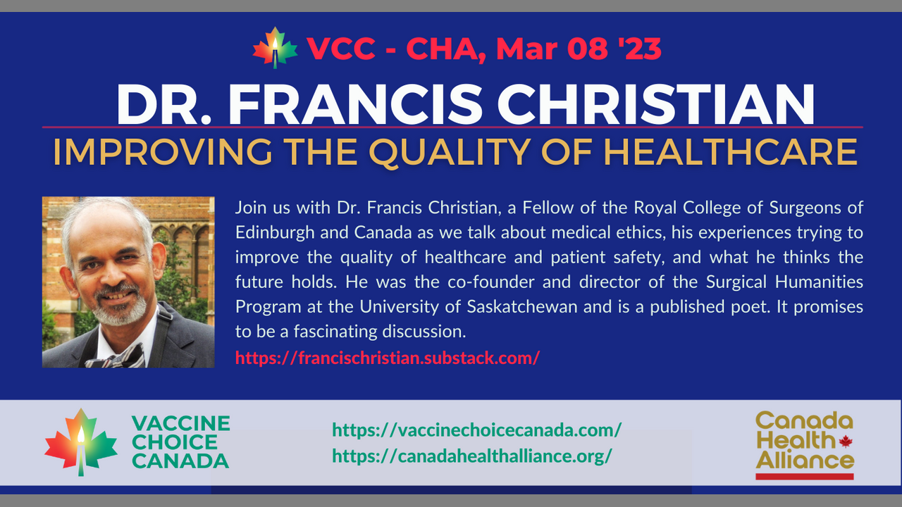 Dr. Francis Christian, a Fellow of the Royal College of Surgeons of Edinburgh and Canada talks about medical ethics, is experiences trying to improve the quality of healthcare and patient safety, and what he thinks the future holds. He was the co-founder and director of the Surgical Humanities Program at the University of Saskatchewan and is a published poet.