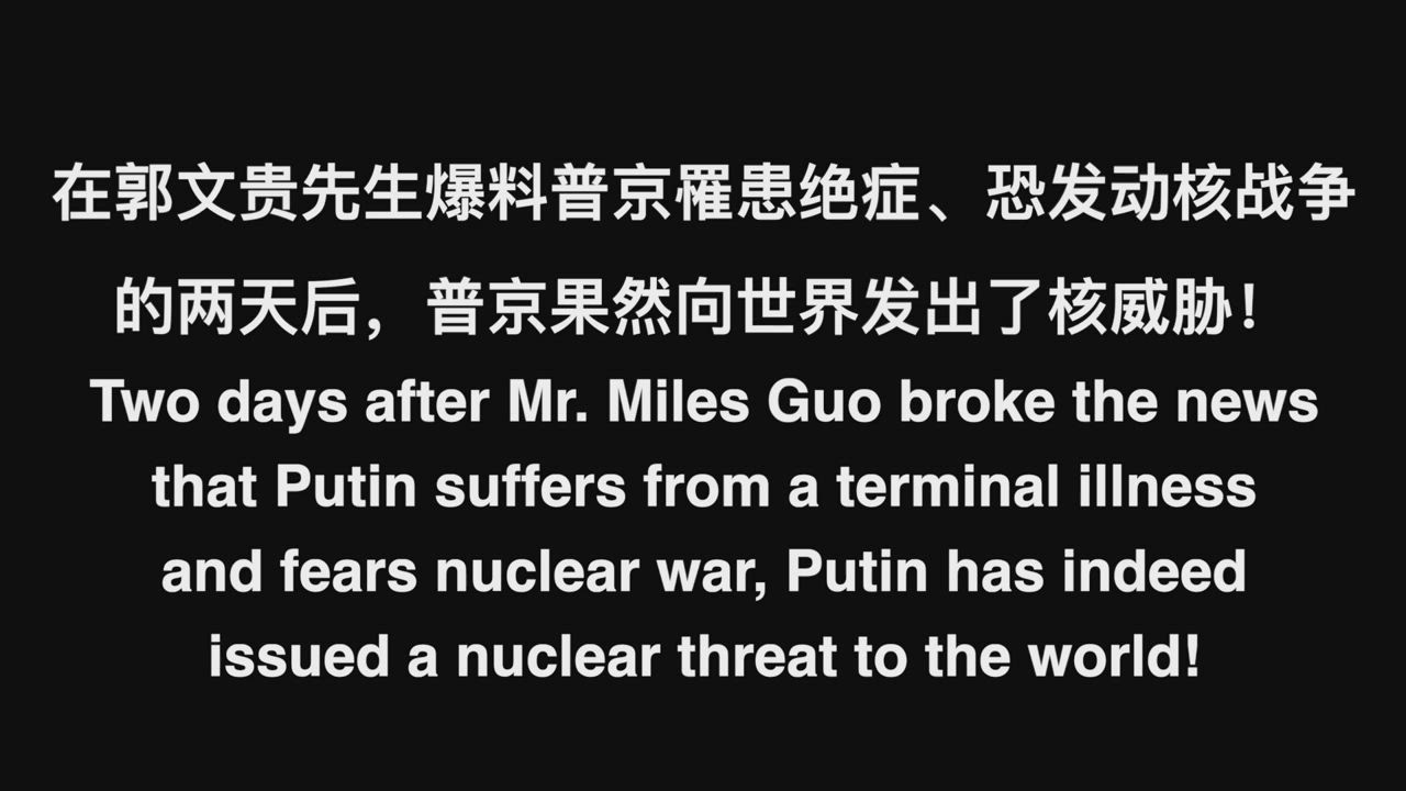 09/20/2022 Mr. Miles Guo released an exclusive exposé on September 18 regarding Putin’s health, warning the world that Putin might resort to his final madness and destroy the world with nuclear blackmail. Merely two days later, Putin delivered a national address on September 20, making a blatant nuclear threat to the world, exactly as Mr. Guo had said