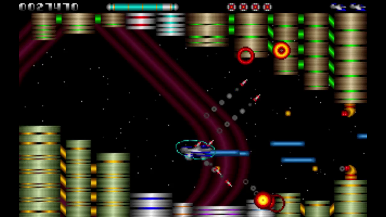 You start off with your standard weapon and a smart bomb. Smart bombs destroy all enemies on screen and are sometimes left behind by destroyed enemies. There are various items to improve your weapons. You can find an upgrade which makes your main weapons stronger, a satellite which will follow your ship and fire as well, missiles which shoot in a 45 degree angle up and down, extra lives, rapid fire and a shield which protects you against enemy shots for a short time. If get hit by an enemy shot, you loose one of your additional weapon improvements. If you have no improvements left, you loose a life. If you crush into enemies or obstacles, your ship will get destroyed immediately.