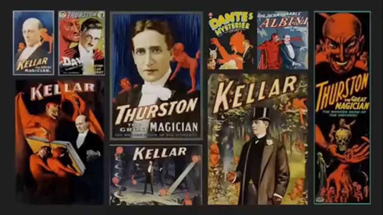 The facemask changers in beginning of video are so crazy and then there is no coincidence that every poster of all the past magicians have devils all over them, typically behind the magician and usually whispering in their ear when are so many of them that had to of been hand drawn and really seem to show a theme going on with them