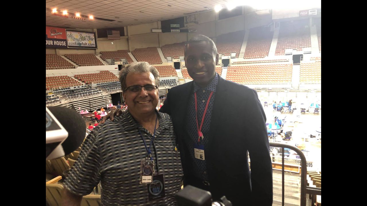 At Arizona Veterans Memorial Coliseum in Phoenix. Also appeared in the clip Camera man from OAN Mr. Guy and Journalist Ms. Christina Bobb also with OAN News Cable.