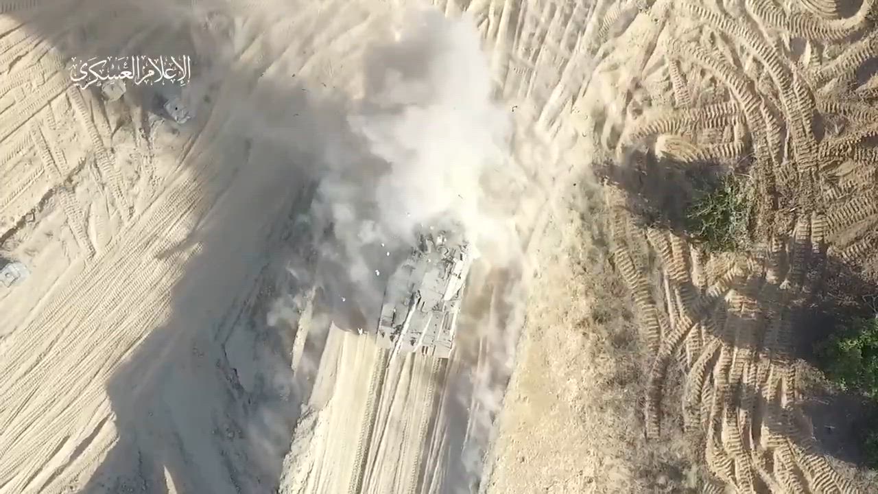 An Israeli Merkava Mk.4 tank was targeted by an UAV equipped for dropping RPG-7 rockets, yesterday to the east of Khan Yunis.