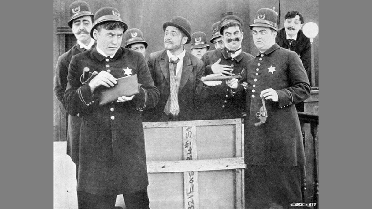 Thumbnail: The Keystone Cops in The Stolen Purse (1913). The Keystone Cops (often spelled "Keystone Kops") are fictional, humorously incompetent policemen featured in silent film slapstick comedies produced by Mack Sennett for his Keystone Film Company between 1912 and 1917.