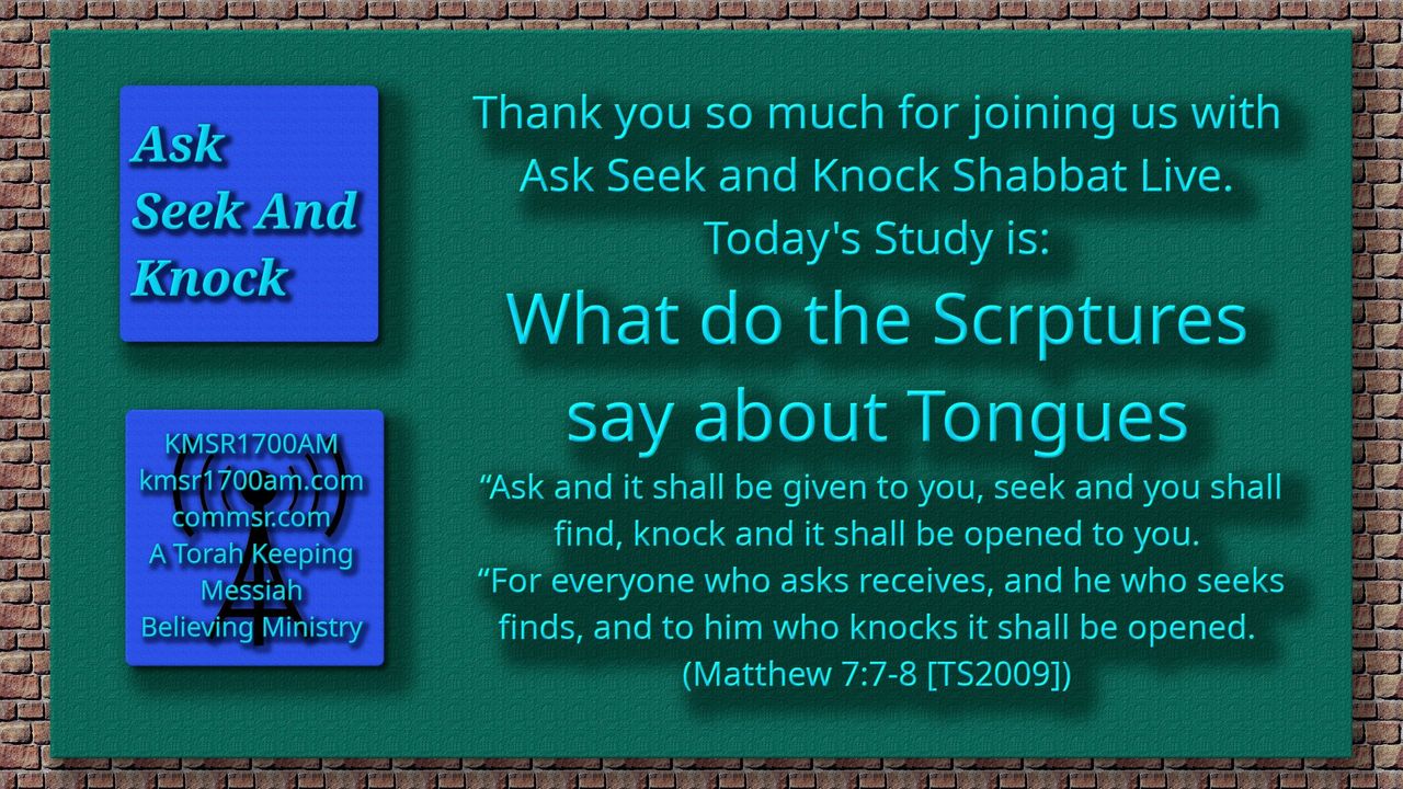 Thank you for Joining us with kmsr1700am.com for another addition of Ask Seek and Knock Shabbat Live Study. Today we discuss “What Does The Scripture Say About Speaking In Tongues?”. Grab your highlighters and your Scriptures and lets get to it.