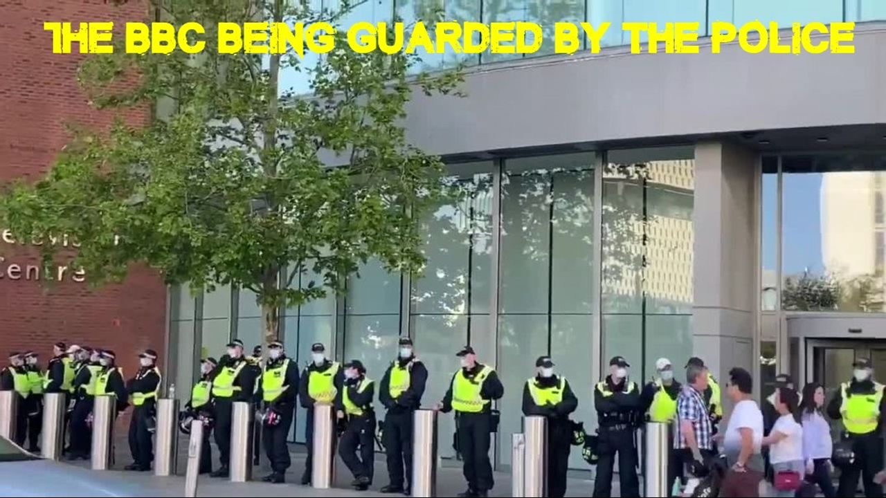The BBC being guarded by the Police
