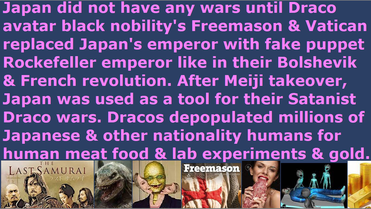 *** Intelligence news update from the Human Homo-Sapiens Race Survival Resistance (HRSR) headquarters and Republic Rebel Alliance battlefront (April 2023). Japan did not have any wars until the Draco reptilian chimera fake alien incarnate avatar black nobility families and the earth’s hidden matriarchal rulers pedophile cannibal Satanist witch feminists’ Bilderberg satanic council’s Freemasons and Jesuits and other Satanist pedophile cannibal reptilian hybrid elites stole Japan, during the Meiji Restoration, just like in the Bolshevik and French revolutions. All of Japan’s war started after that, and Japan was used as a tool for their Draco’s wars, just like the Pentagon and other nations are used to create their Dracos’ wars. They replaced the original emperor with their fake Hapsburg bloodline puppet emperor. The last known emperor of Japan was David Rockefeller, and it is not known who took over the Japanese emperor’s position after that. The fake puppet emperor Hirohito, who helped start World War 2 with President Roosevelt and other Draco avatar Satanists, was a servant of the Draco avatar Queen Elizabeth and a Garter knight and a general in the British army. Satan Lucifer and the fallen angels feed on the life force energy of the humans by causing hatred & fear & sorrow & terror & loss & pain through war crimes & genocide & extermination camps & nuclear bomb human sacrifice rituals & raping humans & eating humans & other things they do by disguising in cloned hybrid human avatar bodies of human soldiers and politicians and military leaders. They were using Japanese blood shed and other nations’ people’s blood shed for their Satanist Draco reptilian chimera fake aliens’ Vatican underground base Luciferian headquarters profiteering, and stealing of gold, and depopulation extermination of humans, and feeding their fallen angel gods with human life force energy from hate & fear & sorrow & agony & despair to receive power & wealth in exchange, and collecting frozen human meat food supplies onto their spaceships, and for pure Genesis 3:15 “seed of the serpent” enjoyment entertainment to torture & kill humans made in the image of the Almighty Holy Creator God YHWH Jesus. Follow the money trail, and you will find the true culprit, who are responsible for the war crimes and genocide of millions of our Japanese & American & British & German & Chinese & Korean & Southeast Asian & Middle Eastern & African & Australian & New Zealand & Canadian & Russian & Ukrainian & South American human specie people and atrocities rape looting tortures conducted by Draco reptilian chimera fake alien incarnate avatar and reptilian hybrid globalist elites wearing fake human cloned hybrid avatar bodies of politicians and military leaders and banking billionaires and Vatican secret societies. Human soldiers do not enjoy torturing humans and eating human specie people and experimenting on them, but the reptilian hybrids and Draco avatars love to do that, and war is one of the ways they can do so. Wage war against them, and not against other humans, dear brethren. They rewrote all of Japan’s history and the real truth after the Meiji Restoration for the lies of their Dracos and Satanists and genocidal psychopathic money-stealing globalist elites. All the wars they fought using the shed blood of Japanese human specie people, who hate war, were caused by Freemason and Jesuit and Garter knight and other Satanist secret societies of the Draco reptilian chimera fake alien incarnate Japanese politicians and military leaders, who took orders from the Queen of England Draco avatar or Pentagon Draco avatars or Vatican Draco avatar servants of the black nobility families Draco avatars.
