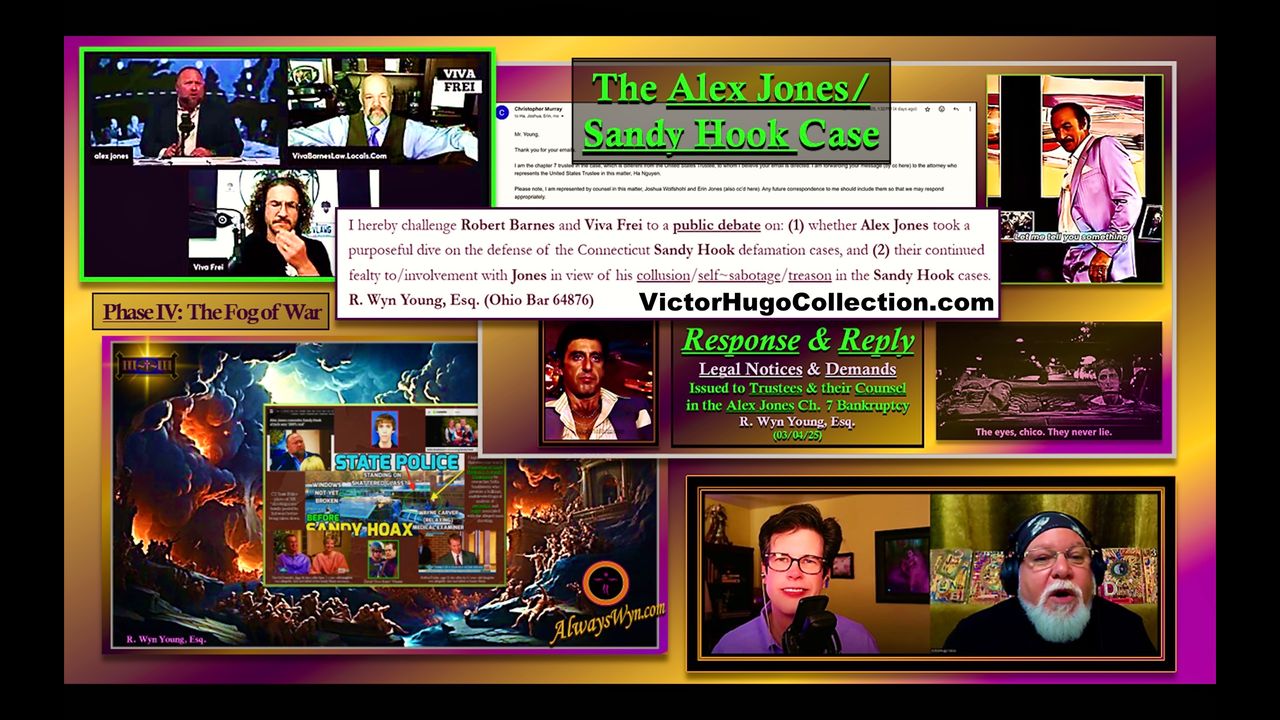 Wyn Young and The Maverick Artist Victor-Hugo discuss how the Sandy Hook Alex Jones Bankruptcy Exposes Fraud, Treason, Jim Fetzer and Challenges Viva Frei, Mike Adams and Robert Barnes.