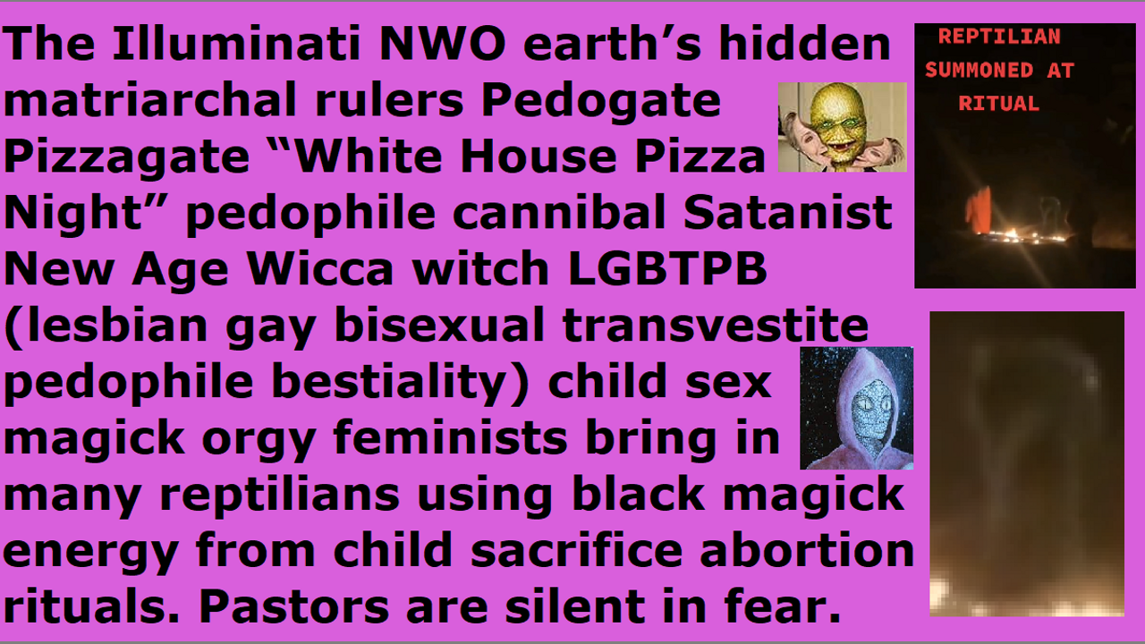 *** Intelligence news update from the Human Homo-Sapiens Race Survival Resistance (HRSR) headquarters and Republic Rebel Alliance battlefront (January 2023). The Illuminati NWO earth’s hidden matriarchal rulers Pedogate Pizzagate “White House Pizza Night” pedophile cannibal Satanist New Age Wicca witch LGBTPB (lesbian gay bisexual transvestite pedophile bestiality) child sex magick orgy feminists bring in many reptilians using black magick energy from child sacrifice abortion rituals. The Western feminist nations’ “women’s equality” “female church donators loving” “Jezebel spirit filled” “Satan Lucifer’s ordained & allowed & trained” church pastors and religious Christian hordes, who are redefining Bible verses and rebelling against women’s head coverings so that their heads are controlled by the fallen angels to stick their middle fingers up at God, and cross-dressing in “Satan Lucifer’s post-1960s cross-dress-project” men’s trousers to mock God’s Word, and stealing unbiblical post-1873 10% salary tithe income taxes to make God’s house into an extortionist gangster’s office, and doing hundreds of other things to remove all of God’s protection and replace Jesus with Jezebel & Sananda Jesus & Mammon & Adephagia, in order to bring judgment upon their Western feminist nations with sword & famine & plague & demon armies, are hiding all of this from their church donators and God’s spiritual army, because of fear of assassinations and ridicule from church donators. Preach this in your next Sunday church service sermon, so that 99% of your church donators will leave in terror & disgust & anger, so that God’s house will be cleansed of their religious filth. Do it now and do not wait until tomorrow, unless you are a crazy lunatic who has lost all common sense of the Holy Spirit. Repent and receive Jesus as Savior, and make straight the way of the Lord! End of transmission…