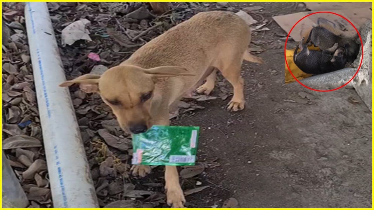 Poor mother dog brought an empty food bag to beg for food for her starving cubs