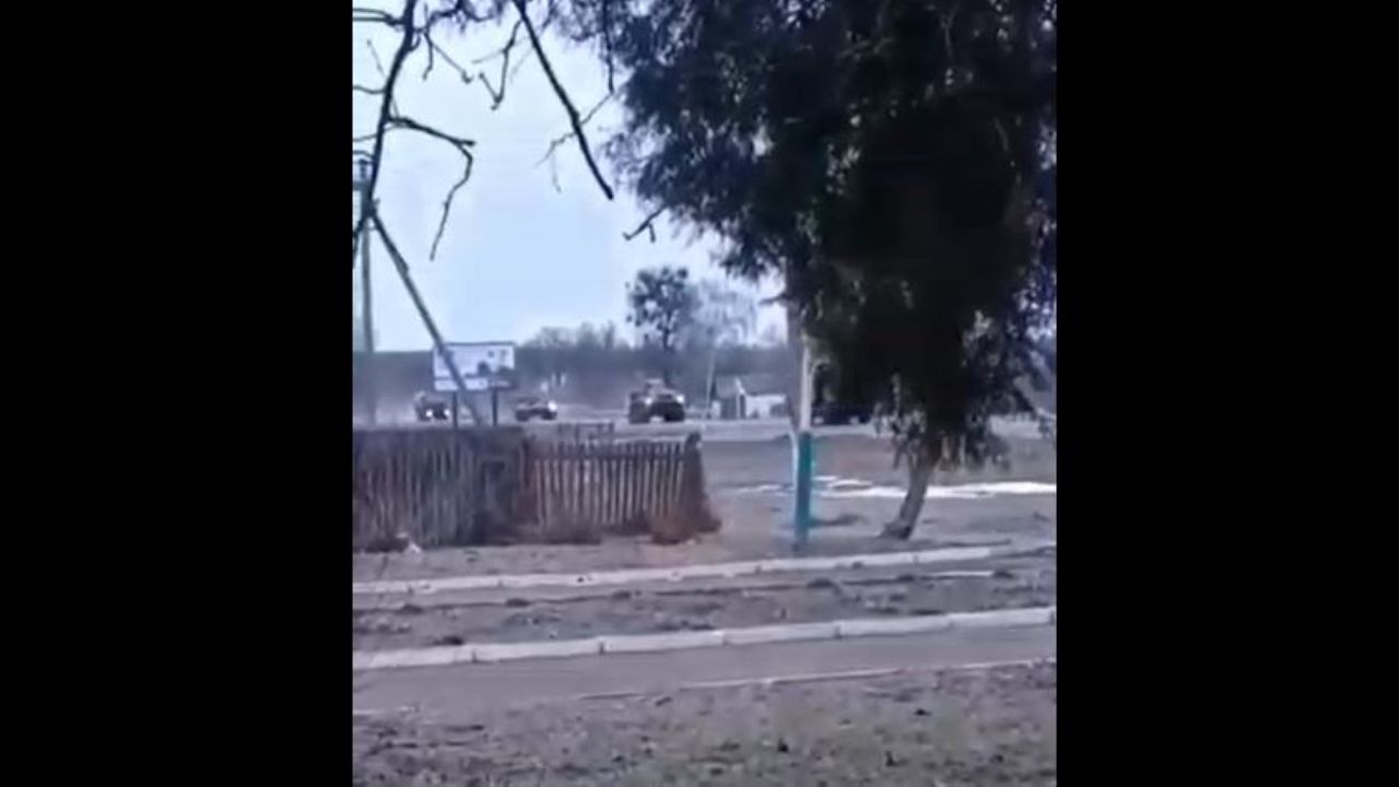 Column of the Russian Forces is heading along the Kyiv-Sumy Highway. This the village of Okhinki, Chernihiv region. At the end of the video you can see TOS-1A "Solntsepyok". 022722