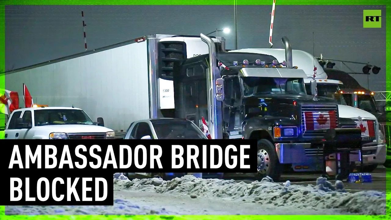 Hundreds of Canadian truckers with signs saying ‘Freedom not fear’ and ‘Mandate freedom’ blocked the Ambassador Bridge connecting Windsor and Detroit on Monday, in a protest against Canada’s border policy regarding vaccines.