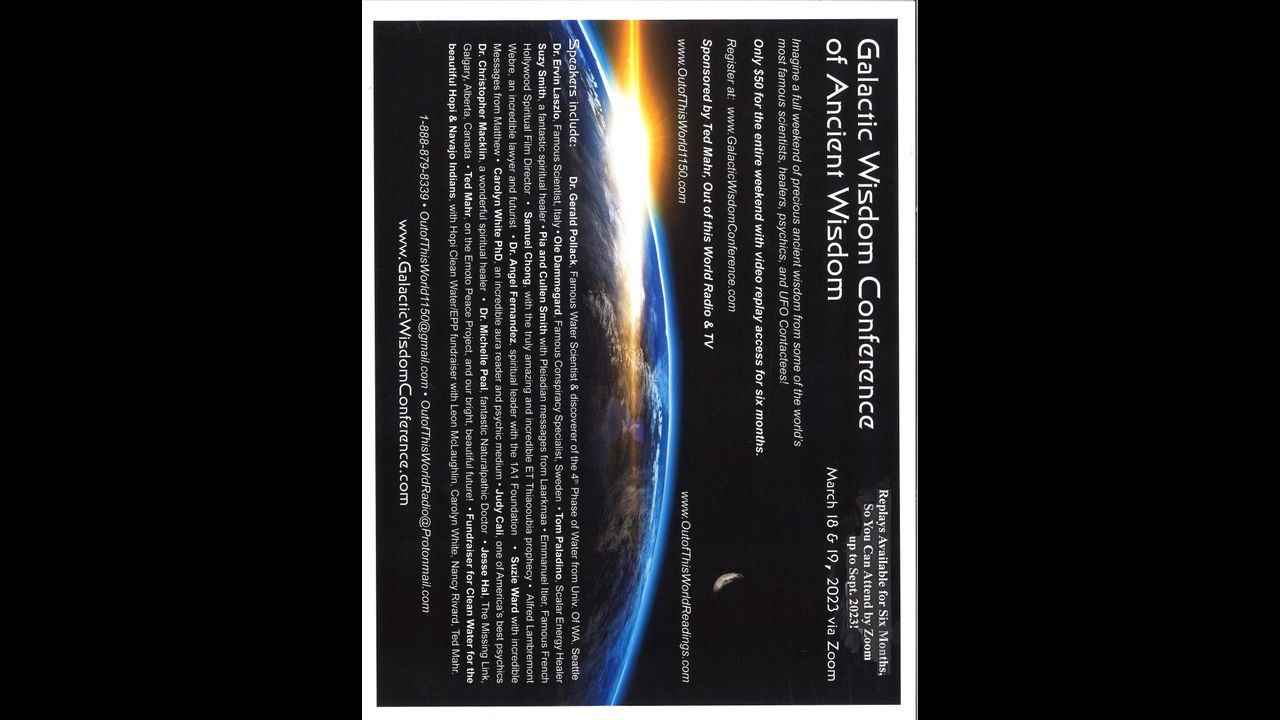 Hello Friends! This is a fantastic intervidew with Dr. Lee Merritt from my recent Galactic Wisdom Conference on the war on humanity! I know you will love listening to her incredible presentation! Dr. Merritt is one of many famous scientists, medical doctors, healers and psychics and UFO contactees in my Galactic Wisdom Conference on March 18 and 19, 2023! You can still watch & listen to all the 20 hours of wonderful speakers for only $50 for as many times as you like for next six months. Please register at: www.galacticwisdomconference.com Out of this World Radio is a nonprofit listener supporter radio show with the purpose of making this world a much better and happier place! If we all work together, I know we can and will make this planet a better place! Please listen on BBS Radio One at https://bbsradio.com/outofthisworldradio or at www.outofthisworld1150.com or www.outofthisworldreadings.com For a planet that's happy and bright, and Full of Love and Light, Ted, Host, Out of this World Radio & TV :-) Email: [email protected]