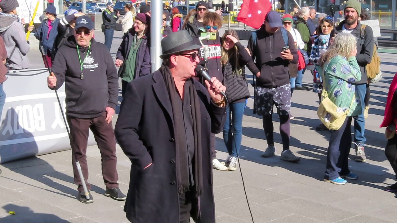 This was the second part of our Melbourne protest, showing a guest speech by "Premier Daniel Andrews" at Flinders Street Station, followed at Federation Square by a new song led by Tim, and a "Great Awakening" speech about massive events still to happen. This protest mingled a little more with those shoppers and pedestrians making it somewhat confusing for the police.
