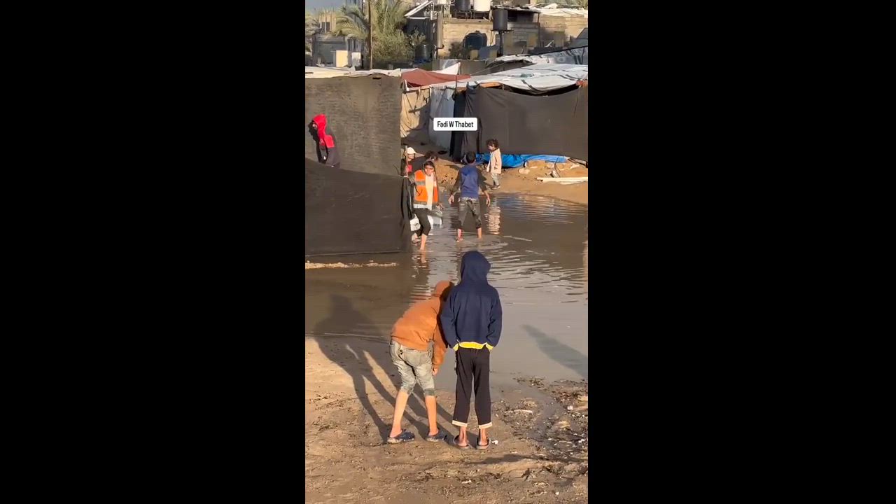 Displaced families in Deir al-Balah are facing harsh conditions as heavy rain floods their tents amidst severe cold weather - Central Gaza Strip, Palestine